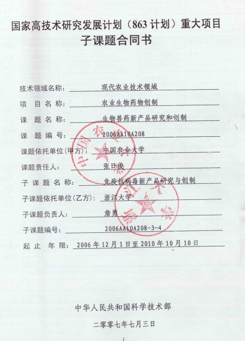 浙江大學詹勇教授承擔國家863課題《免疫抗病毒新產品研究與創制》