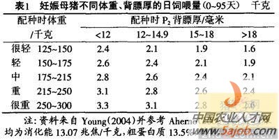 通常豬場常按妊娠母豬體況投料,無視母豬體重,是常易造成大體重母豬得不到充足養分的關鍵因素。下面根據配種體重和P2背膘厚,確定高瘦肉型妊娠母豬飼喂量的參考標準,見表1。