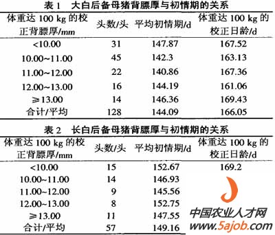 1.3 數(shù)據(jù)分析 測(cè)定的數(shù)據(jù)錄入NETPIG育種軟件進(jìn)行計(jì)算,得出體重達(dá)100 kg的校正背膘厚及相對(duì)應(yīng)的校正日齡。將校正背膘厚和記錄的初情期用Excel 2003進(jìn)行統(tǒng)計(jì)分析,數(shù)據(jù)保留兩位小數(shù)。