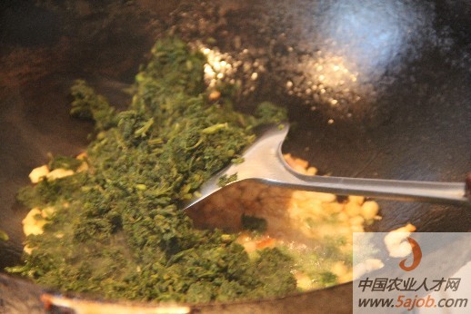 為了讓蒿子粑營(yíng)養(yǎng)均衡、更好吃有香味,切一些自己腌制的咸肉放入鍋中炸,等到油出來(lái)差不多了,將切好的蒿子倒入鍋中翻炒片2分鐘。