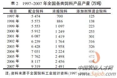 1.3 第三階段:飼料產業調整階段 此階段實質是飼料產業從成長階段逐步邁向成熟階段。其總體特點是:飼料總量增長緩慢,飼料產品結構調整,產品中科技含量逐步加大,飼料人才素質進一步提高, 產品質量安全管理體系不斷完善,產品質量進一步提高,飼料行業競爭激烈并且趨于微利,大型集團化企業穩步發展,飼料安全性日益被重視,飼料業發展仍處于區域發展不平衡狀況。我國飼料工業經過30 年的發展, 取得了令人矚目的成績。我國的飼料工業為農業結構調整、農民增收以及養殖業的持續發展作出了積極貢獻。2006 年進入“十一五”時期后,我國飼料業經歷了禽流感、畜產品價格震蕩、飼料原料價格上漲等不利因素的嚴峻考驗, 飼料工業在生產波動中保持平穩。2007 年,全國飼料工業總產量1.23 億噸,占世界總產量近1/5,其中配合飼料9 319 萬噸,濃縮飼料2 491萬噸,添加劑預混合飼料521 萬噸(見表2)。