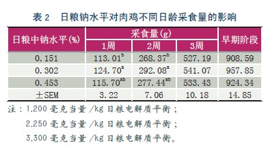 Na、Cl和K在維持正常的滲透壓和酸堿平衡、體組織的蛋白質合成、細胞內外的動態平衡和細胞膜的電位方面有重要的作用。Bidar等研究發現,從前兩周的飼喂來看,在早期日糧中添加0.3%的鈉處理組的采食量最大并且體增重最高(表2)。