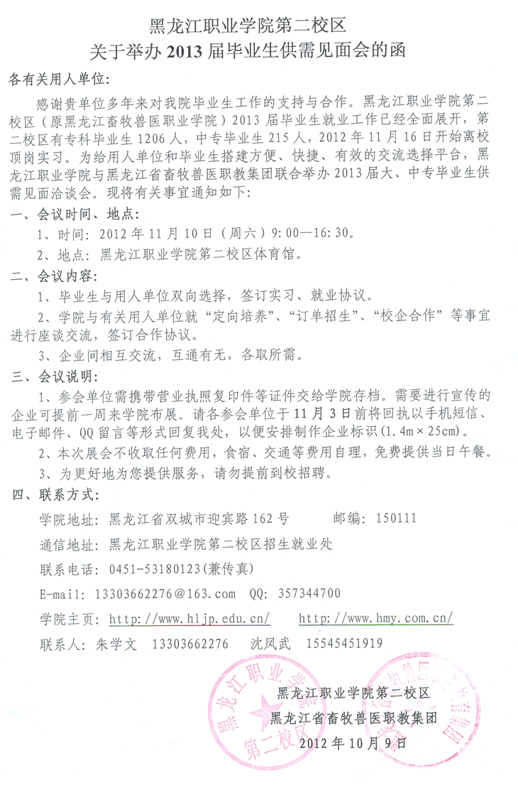 黑龍江職業學院第二校區關于舉辦2013屆畢業生供需見面會邀請函