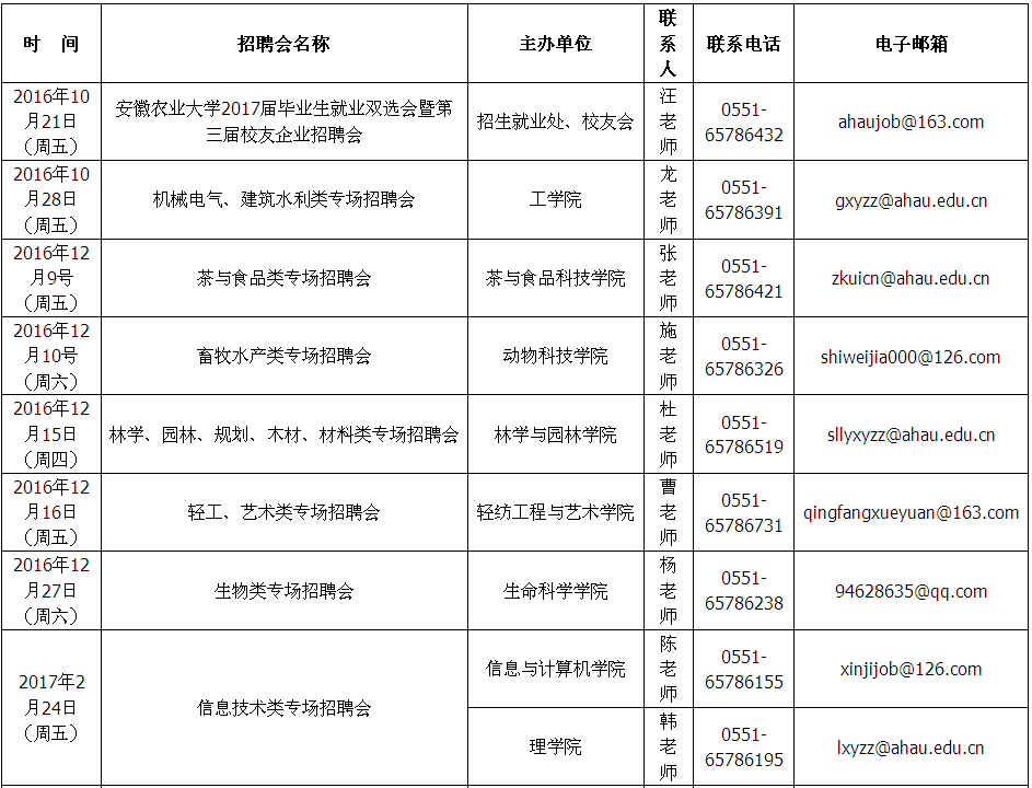 安徽農業大學2017屆畢業生就業專場招聘會安排表